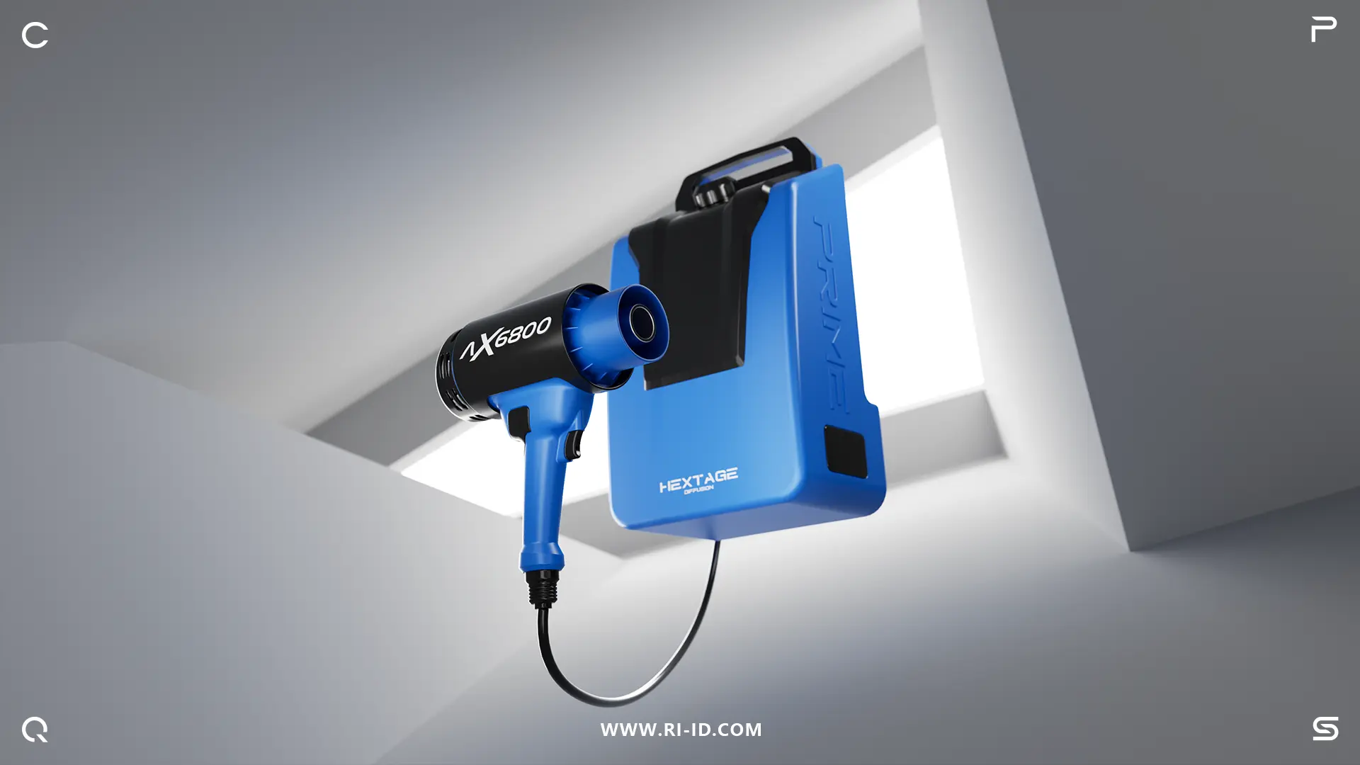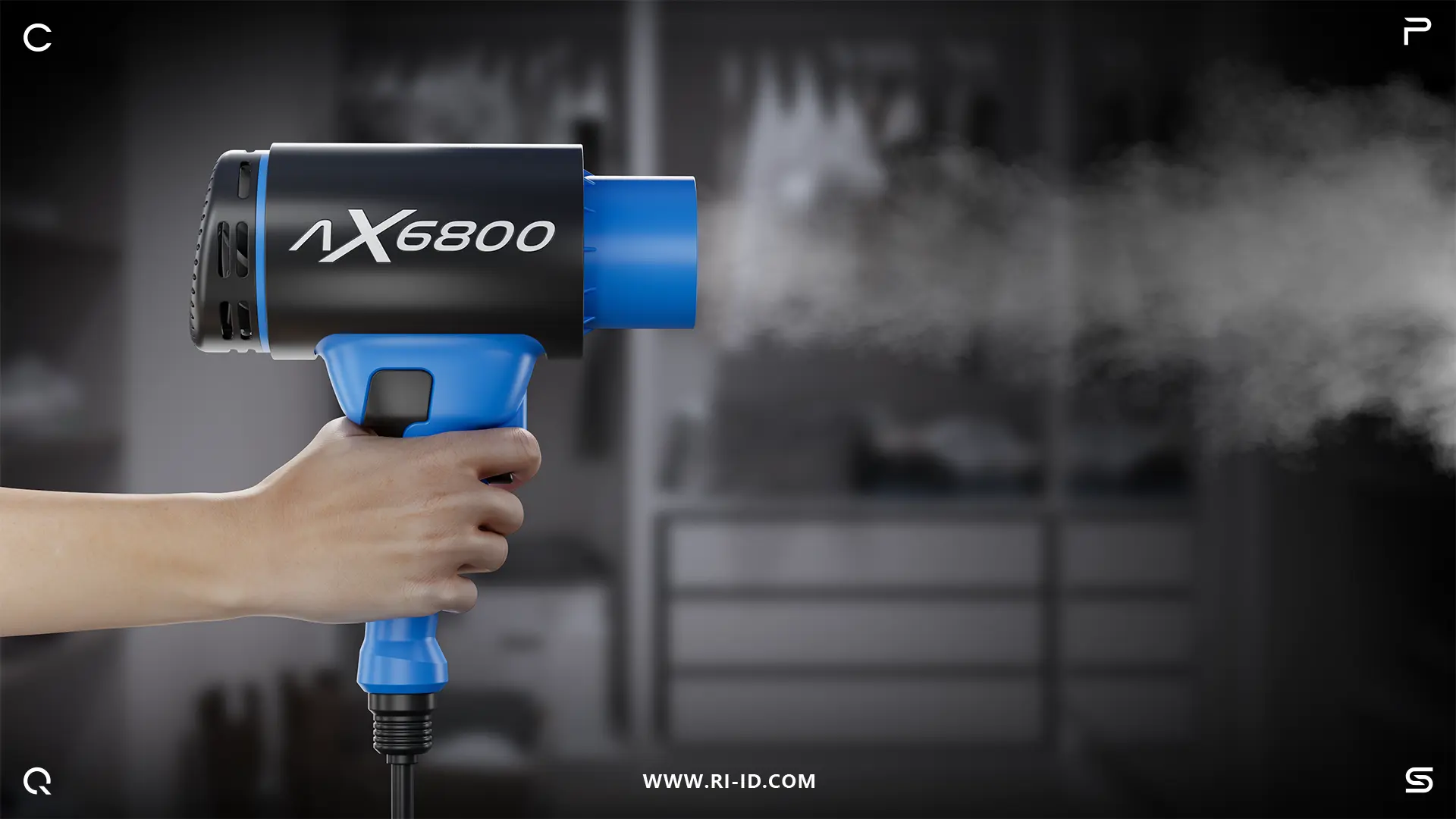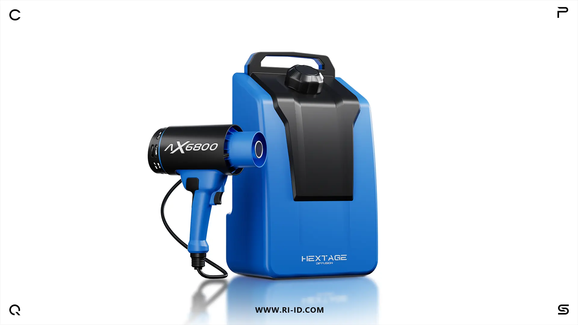 这台湖蓝色喷雾消毒器,以其独特的流体动力学设计、精致的湖蓝色调和高科技的交互界面,不仅展现了现代工业设计的美学特点,还充分考虑了功能性、安全性和环保性,是一款集美观与实用于一身的创新产品。
