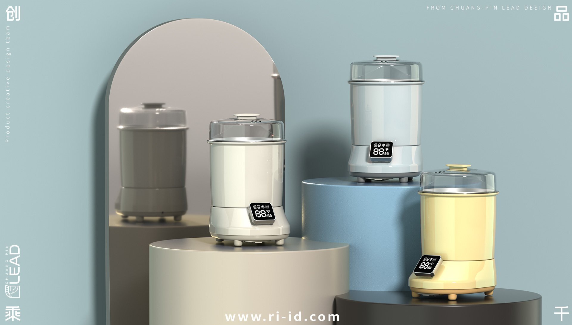 消毒锅产品设计,用于对餐具,特别是婴幼儿餐具、奶瓶之类,进行蒸汽消毒和烘干。传统消毒锅外观都是圆桶状,外观效果较差,此款产品为业内第一款长腰圆形的消毒锅,引领了市场潮流。